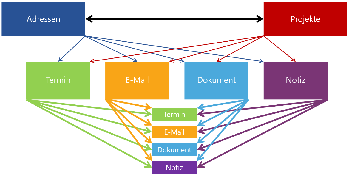 Es können aber auch mehrstufig Objekte an andere Objekte angehängt werden. So kann einer Adresse ein Auftrag angehängt werden. An diesen kann dann die Zahlung aber auch Notizen, E-Mails oder andere Dokumente angehängt werden, usw: