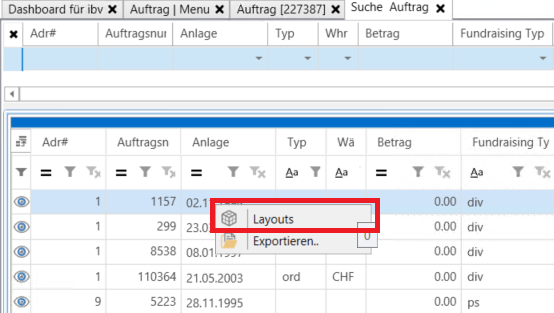 Wenn man eine Suche öfters macht, hat man die Option die Suche als Layout abzuspeichern – dies kann man in allen Suchen der Objekte machen. Dafür muss zuerst eine Suche abgesetzt werden. Danach muss man einen Rechtsklick auf dieser Oberfläche machen: