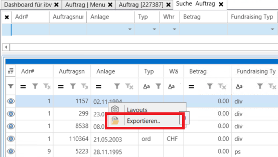 Um einen Export der Suchergebnisse zu machen, muss zuerst eine Suche abgesetzt werden und mit einem Rechtsklick auf der Oberfläche, erhält man die Option «Exportieren…»: